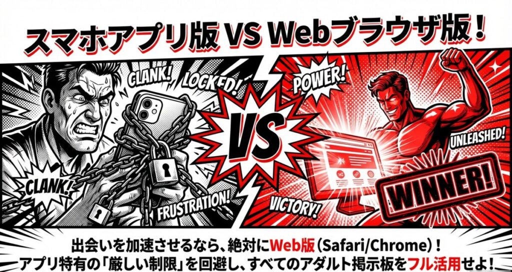 スマートフォン専用のアプリを利用した場合、App StoreやGoogle Playの厳しい審査基準によって、一部のアダルト機能が制限されてしまいます。