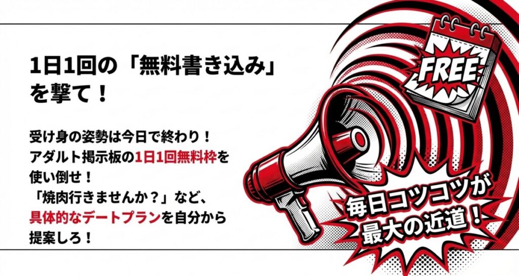 - 1日1回無料の掲示板投稿で具体的なデートプランを提案する→コストゼロで毎日チャンスを作り続けられる