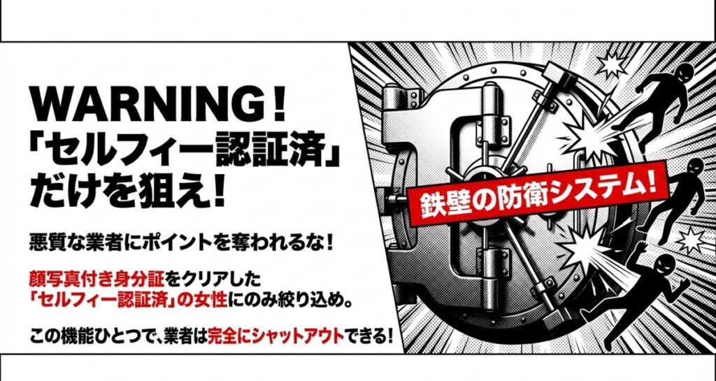 - セルフィー認証済みの女性に絞れば安全かつ無駄なく出会える→ポイントと時間を本物の女性だけに使える