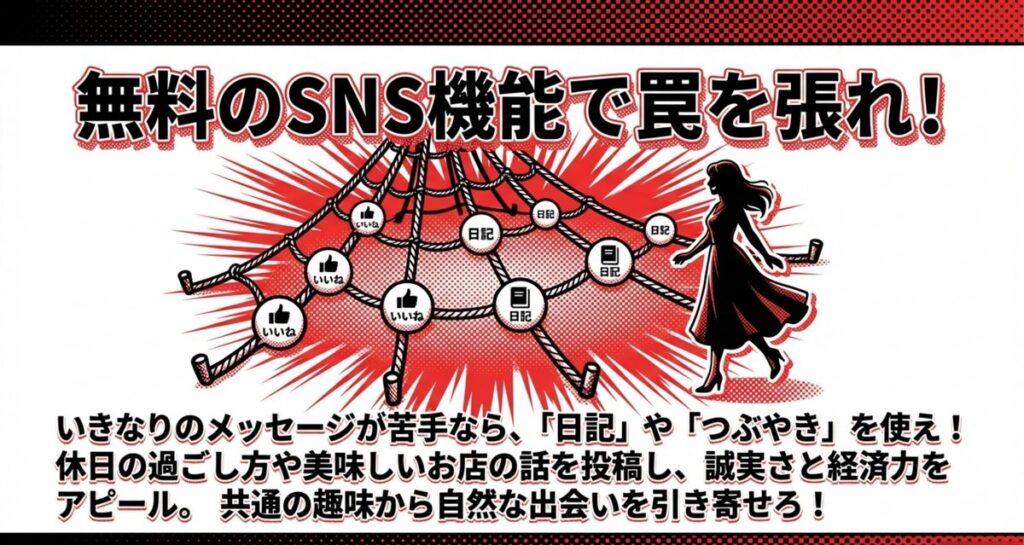 日常の何気ない出来事を投稿することで、プロフィールだけでは伝わらないあなたの人柄を自然にアピールできます。共通の趣味を持つ女性が「いいね」や「コメント」をくれることも多く、そこから自然な流れで仲良くなるチャンスが広がりますよ。