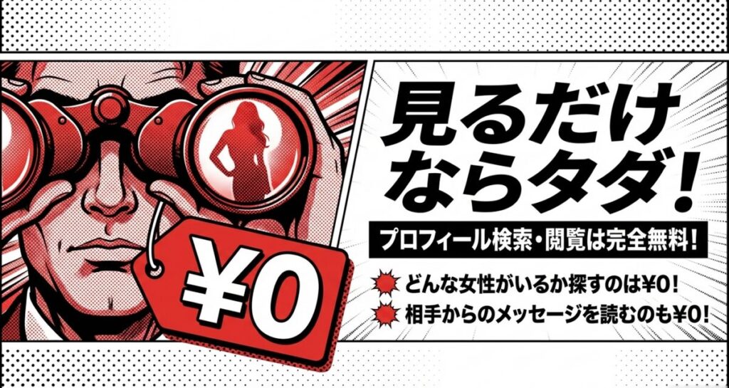 「どんな女性がいるのか見るだけでもお金がかかるの?」と不安に思うかもしれません。実は、プロフィールの検索や閲覧、相手からのメッセージを読むだけなら完全無料なんです。