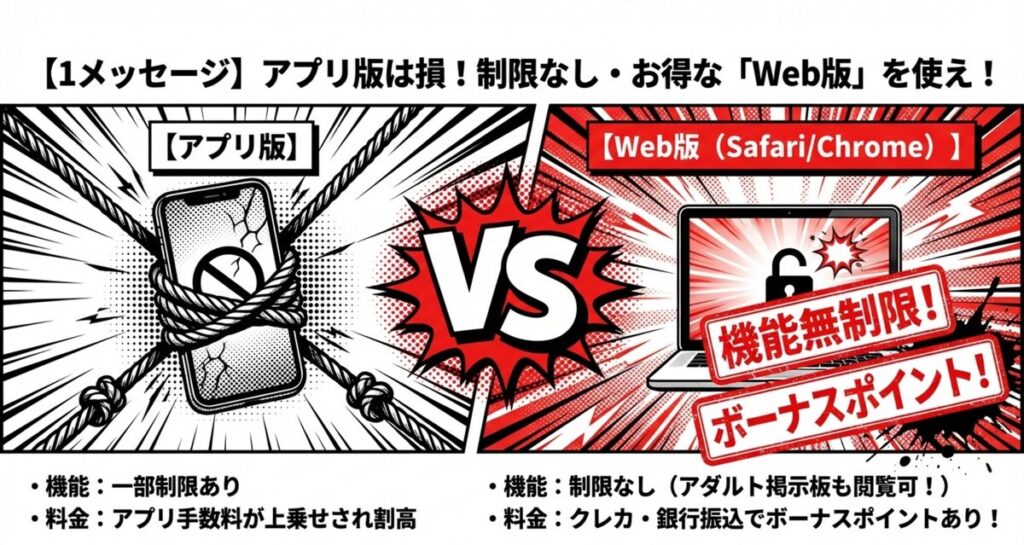 • 「Web版」での利用が機能面・料金面で圧倒的に有利。アダルト掲示板も使えて出会いの幅がぐっと広がる