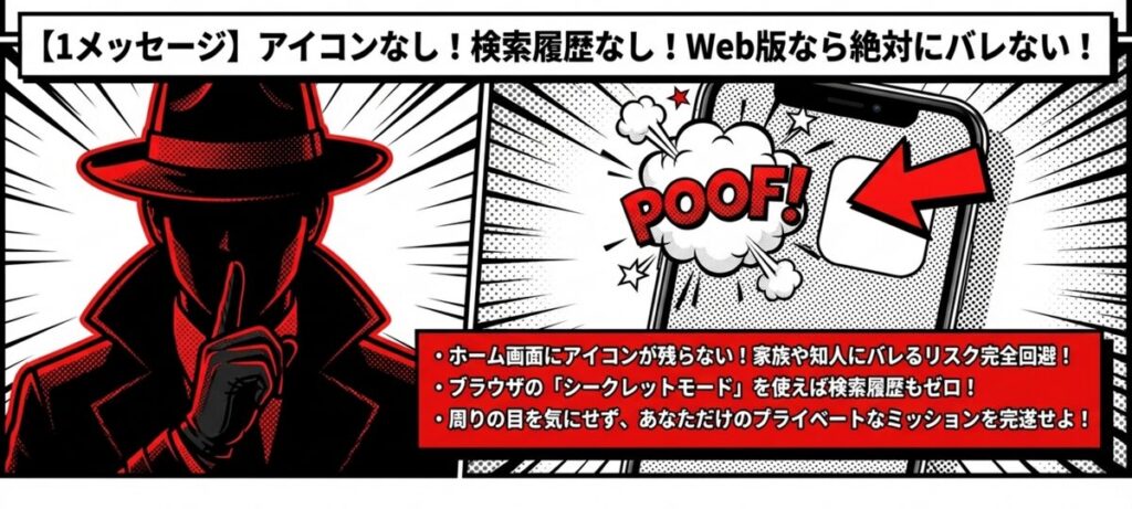 周りの人に利用していることがバレないか、気になってしまう方も多いですよね。Web版を利用すれば、スマートフォンのホーム画面にアイコンが表示されません。