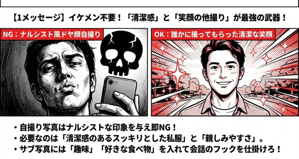 プロフィール写真は、あなたの第一印象を決める最も重要な要素です。イケメンである必要は全くありません。大切なのは、清潔感と親しみやすさです。