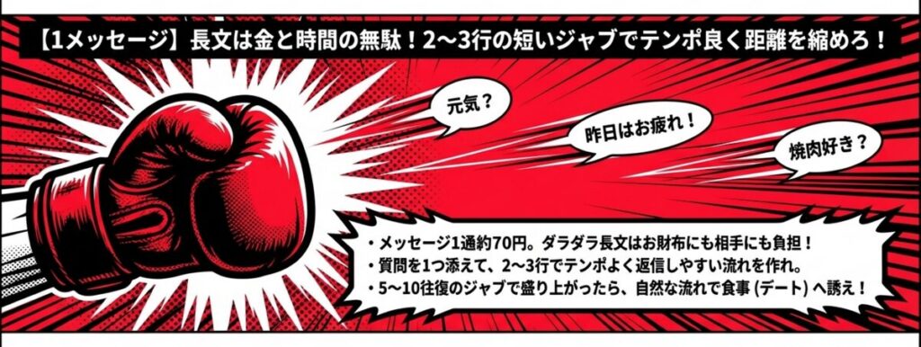 LINEのように、2〜3行の短い文章でテンポ良く会話のキャッチボールを行うのが、ポイントを節約しつつ仲良くなるコツです。