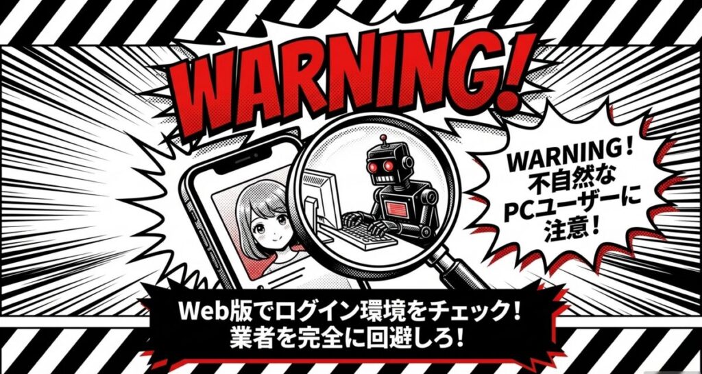 Web版からプロフィールを見ると、相手がパソコンからアクセスしているかどうかが分かる機能があります。一般の女性はスマートフォンから利用することがほとんどなので、不自然にパソコンからアクセスしている女性は業者の可能性があると判断できます。
