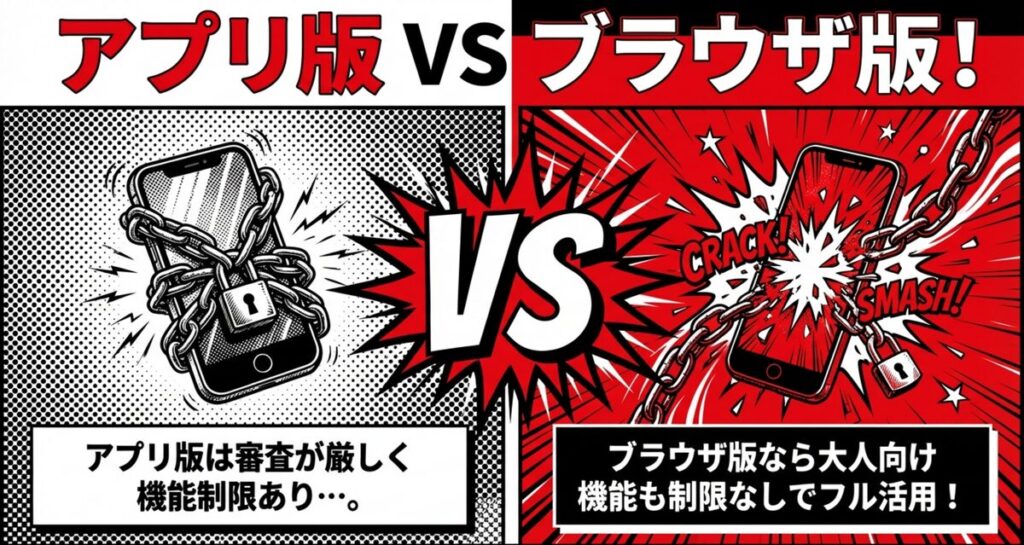 アダルト掲示板や裏プロフィールといった大人向けの機能も、ブラウザ版であれば問題なく使えます。