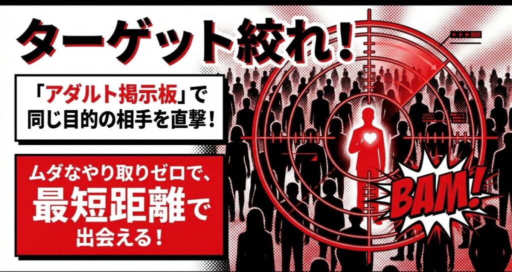 このアダルト掲示板を活用することで、同じ目的を持った女性を効率よく探すことが可能になります。目的が合った相手と出会えるため、ムダなやり取りを大幅に減らせるのも大きなメリットです。