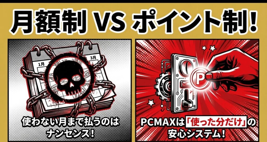 PCMAXの料金は、事前にポイントを購入し、行動するごとにポイントを消費するシステムです。月額制のように「まったく使わなかった月まで料金を支払う」必要がないため、非常に合理的な仕組みになっています。