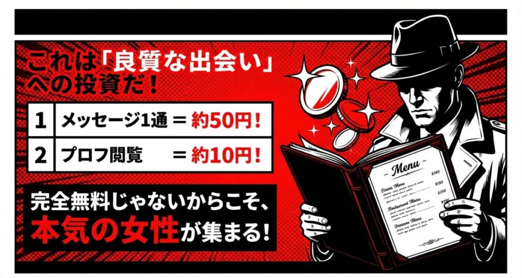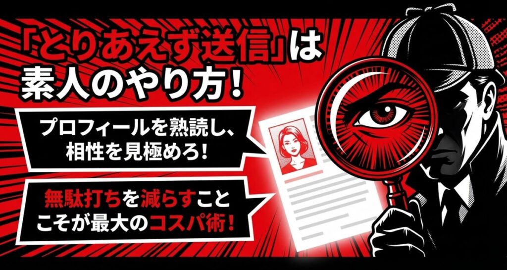 プロフィール閲覧のポイントを惜しんで「とりあえず送ってみる」戦略は、長期的には損になりますよ。無駄打ちを減らすことこそが、成功への秘訣です。