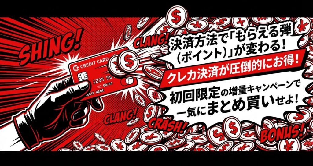 ポイントを購入する際、インターネット経由のクレジットカード決済を利用すると、驚くほど多くのボーナスポイントが付与されます。コンビニ払いや携帯キャリア決済と比べると、その差は歴然です。