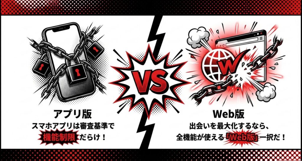 スマートフォン専用アプリ経由でPCMAXを利用すると、プラットフォームの審査基準によって一部の機能が制限されてしまいます。