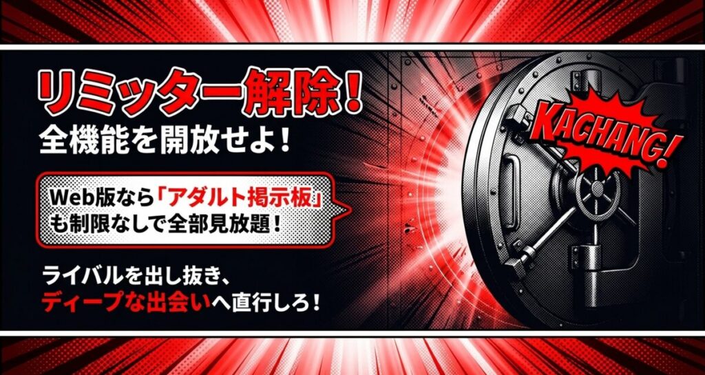 • Web版なら機能制限なしでアダルト掲示板を含む全機能が使えるので、出会いの幅が一気に広がる