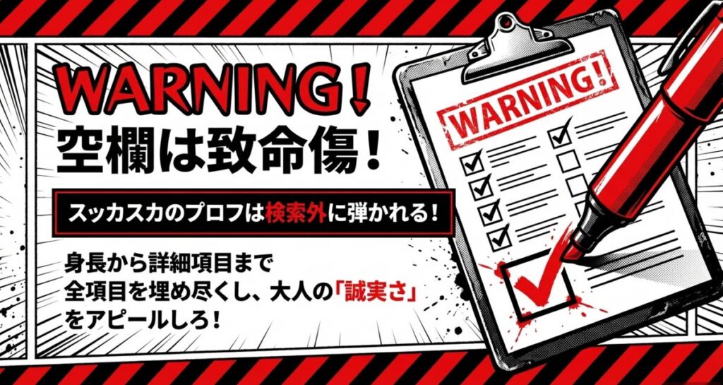 空欄が多いプロフィールは「やる気がない人」と判断されやすく、女性の検索結果にすら表示されないケースがあります。