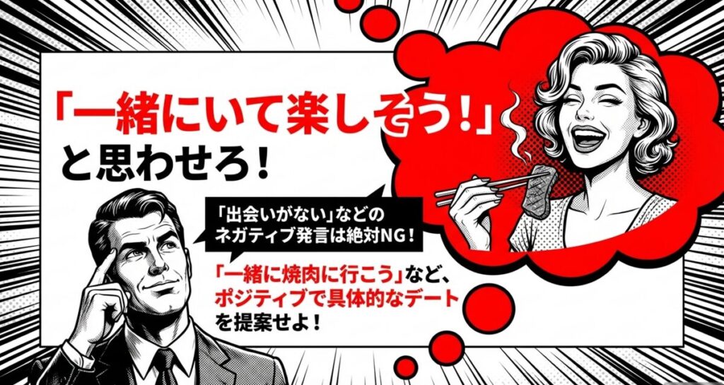 • 「焼肉を一緒に食べに行きませんか?」など具体的なデートプランを提案する