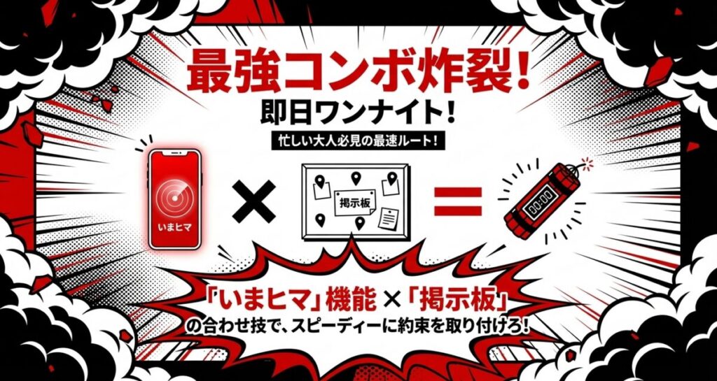 今まさに時間が空いている相手を探せる「いまヒマ」機能と、アダルト掲示板の募集を組み合わせるのが、ワンナイト実現の最強パターンです。