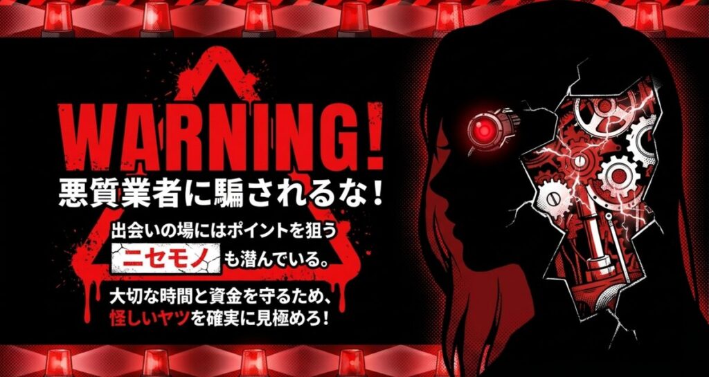 怪しい相手の特徴を事前に知っておくだけで、大切なポイントもお金も時間も、無駄に消費せずに済みます。このセクションでは、安全に楽しむための具体的な業者見極め術と、PCMAXの安心サポート体制についてお伝えします。