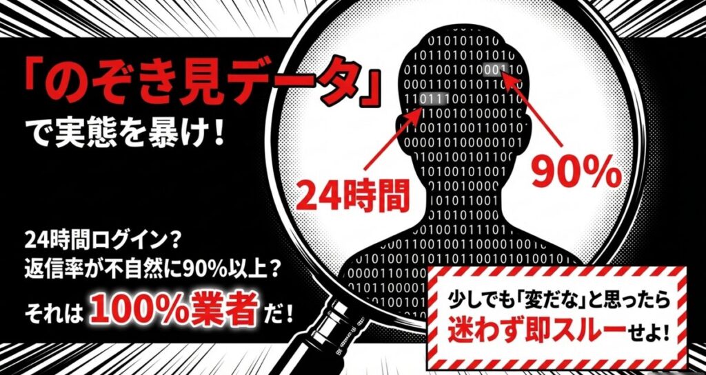 24時間常に活動していたり、返信率が異常に高いといった機械的な動きをしている相手は、このデータを見るだけで一目で見抜くことができます。