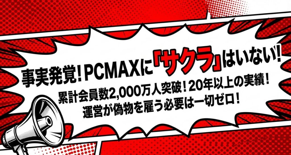 PCMAXは20年以上の運営実績と2,000万人以上の会員を誇り、運営が偽のユーザーを雇う必要がないためサクラはいません。ただし、外部から紛れ込む業者は存在するため、見分け方を活用して自衛することが大切です。