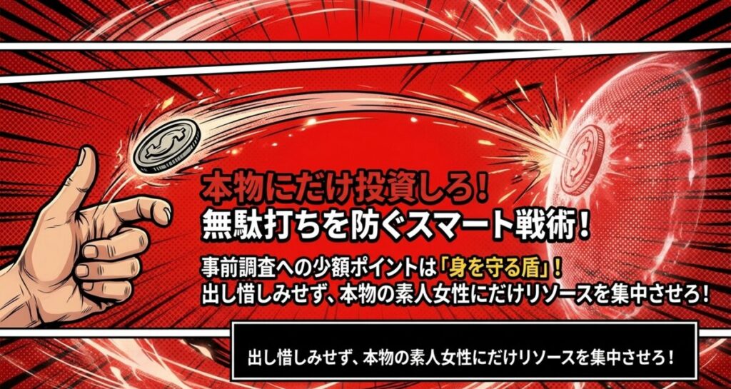 業者に騙されて大量のポイントや時間を無駄にするよりも、事前に相手を見極める方が、結果的に圧倒的なコストパフォーマンスに繋がります。これは、本当に魅力的な女性と出会うための「賢い大人の投資」と言えます。